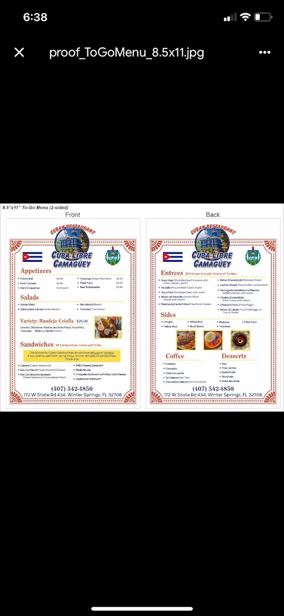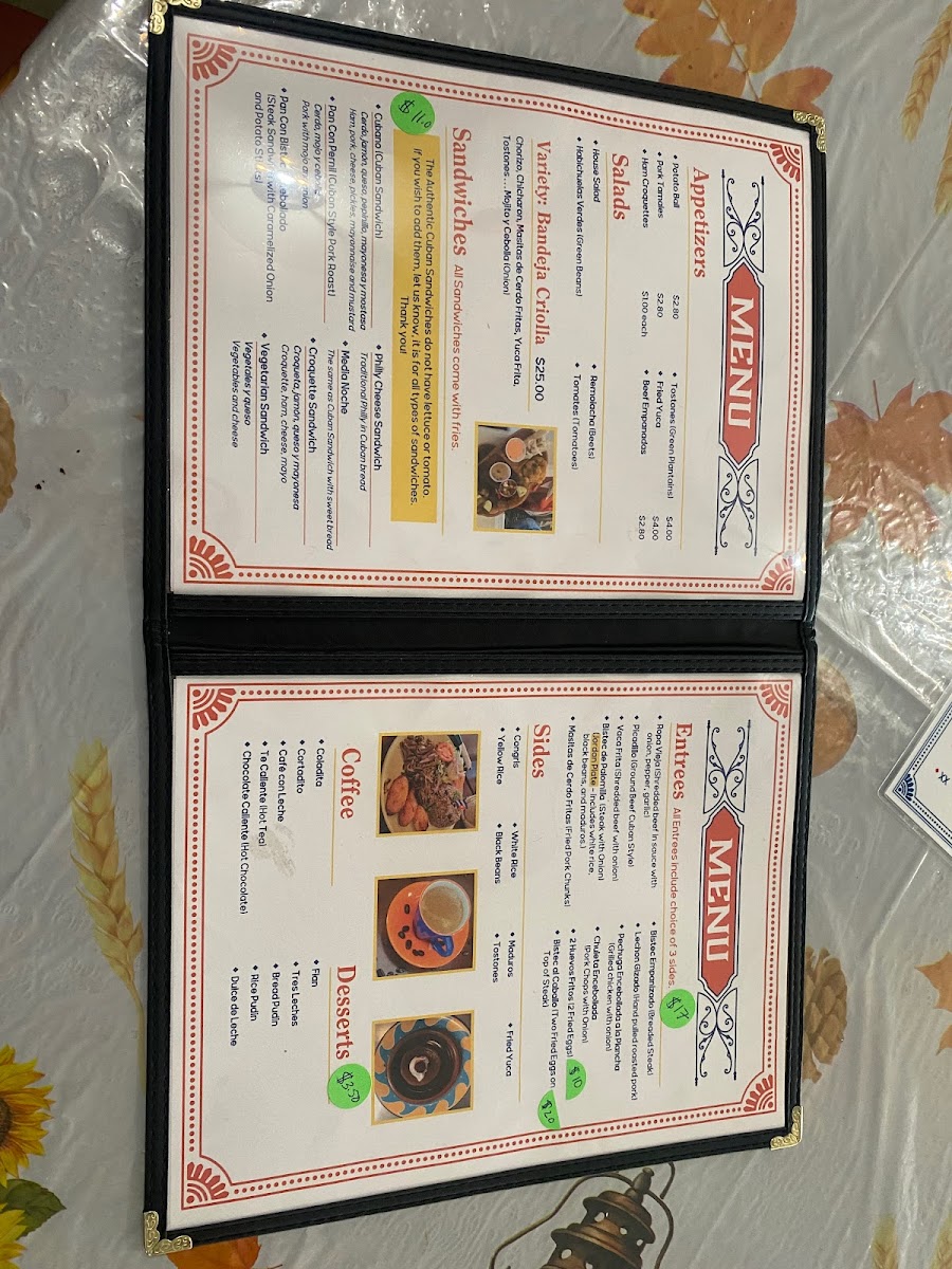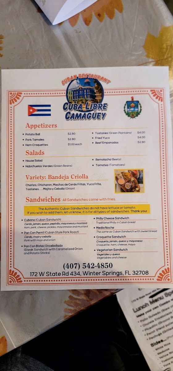 Welcome to Cuba Libre Camaguey, a delightful café nestled in Winter Springs, FL. Here, you'll discover a treasure trove of authentic Cuban cuisine, where every dish tells a story. Start your culinary journey with flavorful appetizers like the crispy Bola De Papa or savory Beef Empanadas, each priced at just $2.80. For the main course, indulge in the signature Ropa Vieja, shredded beef that melts in your mouth, or the succulent Lechón Asado for a taste of traditional roasted pork, all at $20. Kids will enjoy hearty options like Cheeseburgers and Chicken Tenders for only $8. The cozy ambiance, warm service, and flavors that transport you straight to Cuba create a dining experience that feels like home. Don’t miss the delightful homemade flan to cap off your meal—it’s a sweet finale worth savoring!